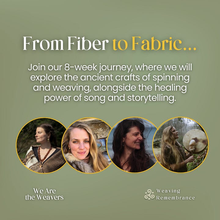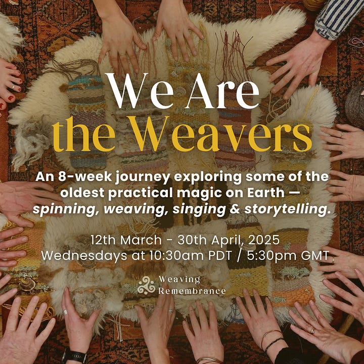It will be an exciting and delightful 8-week journey, where we will explore the ancient crafts of spinning and weaving, alongside the healing power of song and storytelling. ‘Our hands remember…how to gather what’s been scattered, how to spin beauty from chaos, how to weave new worlds into being, how to make magic together.’